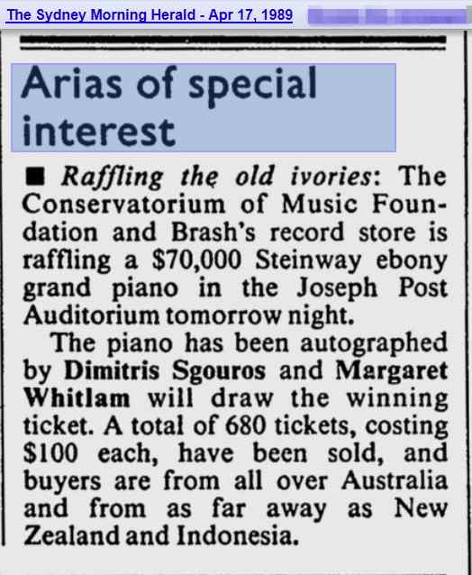 $70,000 Steinway piano autographed by Dimitris Sgouros and Margaret Whitlam (wife of Prime Minister Gough Whitlam)