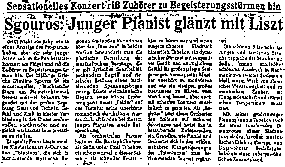 ... Mit technischer Perfektion spielte der 22jährige sowohl den Solopart des Klavierkonzertes Nr. 2 A-Dur, als auch den „Totentanz“, eine Paraphrase über „Dies Irae“ von Liszt für Klavier und Orchester, mit seinem höchst virtuosen Klavierpart. Sicher wurde in beiden Werken das brillante Klavierspiel des jungen Pianisten bewundert, der so viel Applaus erhielt, daß er sich zu einer Zugabe von Chopin bereitfand ...