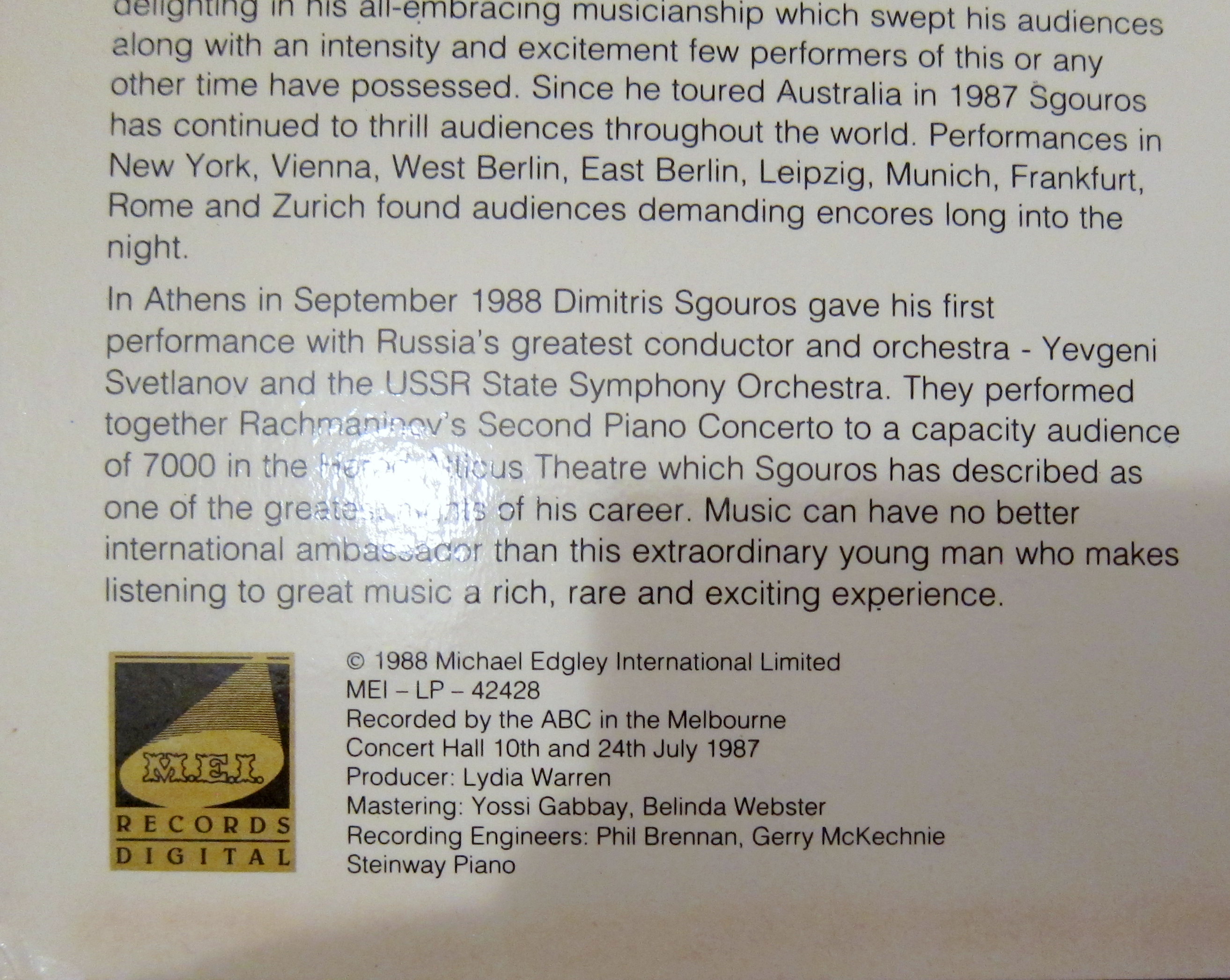 Dimitris Sgouros CD of live recordings from the Melbourne Concert Hall, 10th and 24th July 1987