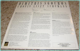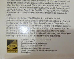 ** Such was the demand for the 1987 Melbourne solo release featured above, that Dimitris Sgouros recorded a second Australian album in 1989 with live performances of Chopin and Liszt culled from his Melbourne Concert Hall and Sydney Opera House recital appearances. This second album on DINO MUSIC was published on cassette, LP and CD and entitled "Dimitris Sgouros Plays Chopin and Liszt"