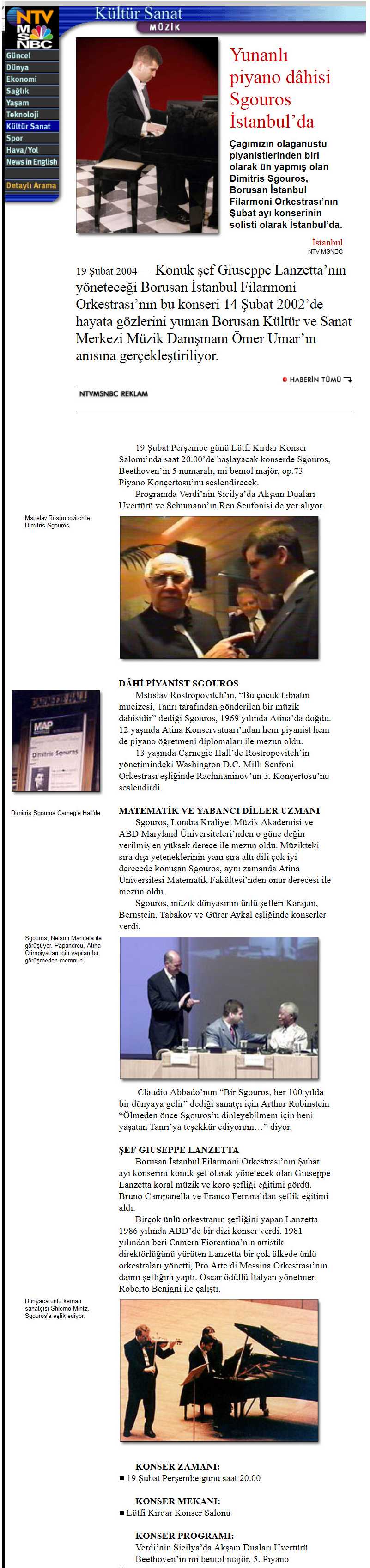 Another Turkish musician Sgouros is on very good terms with is conductor Cem Mansur, with whom he played Beethoven's 4th and 5th concertos in Oxford, England, and Palermo, Italy. Although he hasn't yet listened to Turkish piano prodigy Fazil Say, Sgouros appreciates famous Turkish pianists Gulsum Onay and Idil Biret.