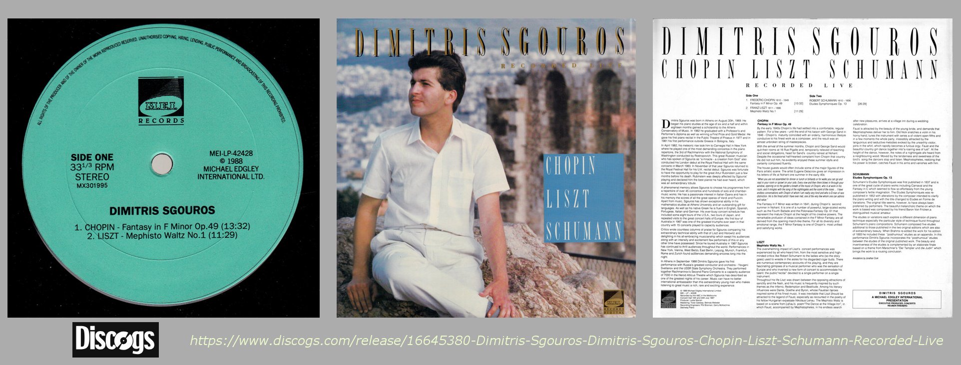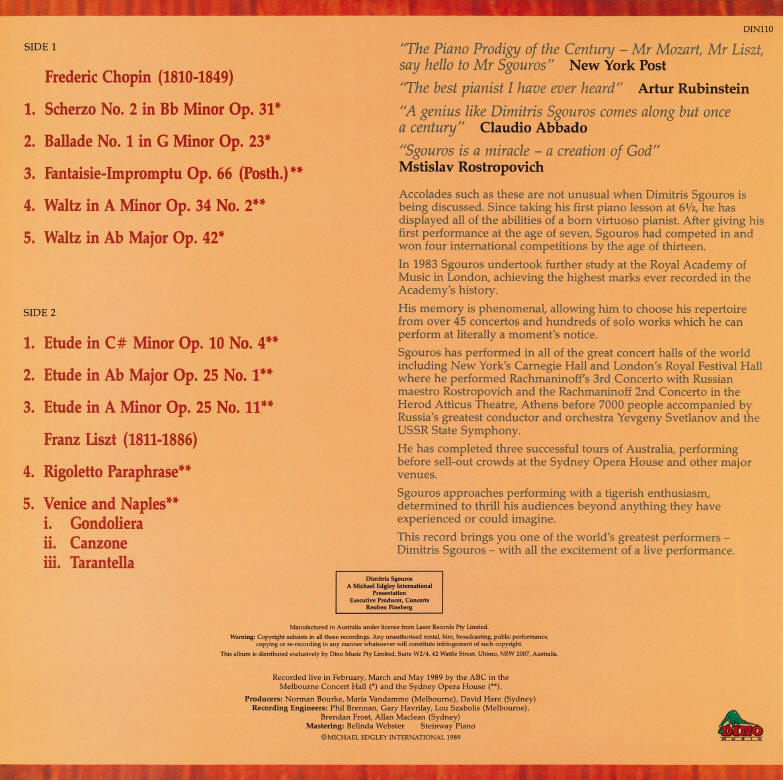 ** Such was the demand for the 1987 Melbourne solo release featured above, that Dimitris Sgouros recorded a second Australian album in 1989 with live performances of Chopin and Liszt culled from his Melbourne Concert Hall and Sydney Opera House recital appearances. This second album on DINO MUSIC was published on cassette, LP and CD and entitled "Dimitris Sgouros Plays Chopin and Liszt"