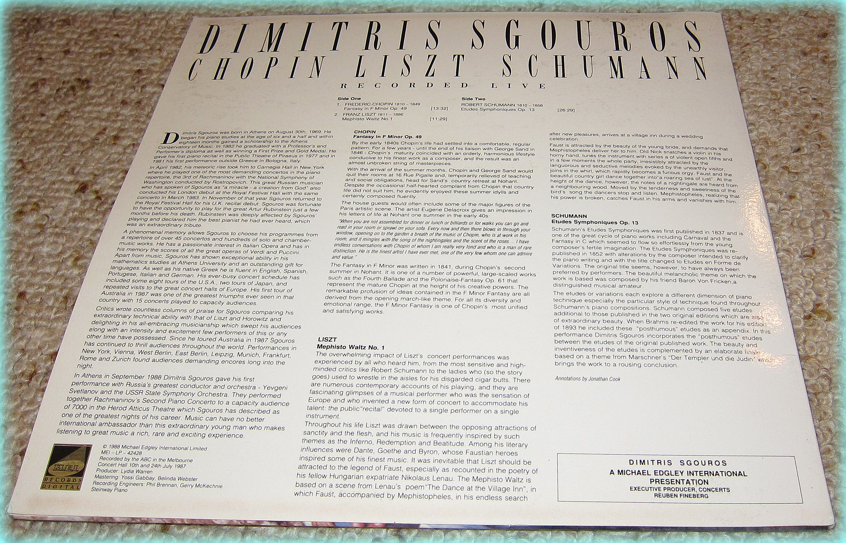 In what is a first for the tour of a classical performer in Australia, promoter Michael Edgley has released a CD of Sgouros's 1987 solo performances here in Melbourne (MEI-CD-42427-A). What those of us lucky to have heard him two years ago probably remember best is the great romantic verve and seemingly effortless ease of his playing. Those qualities certainly appear clearly in this recording, particularly in Chopin's Fantasy in F Minor and Schumann's Etudes Symphoniques. The CD also shows his breadth of style and his great classical control, perhaps best displayed in Beethoven's 32 Variations in C Minor.